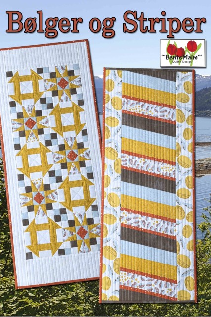 ‘’Bølger’’: Løper med 2 forskjellige blokker. Str: 16” x 38” (41 x 96 cm) Teknikker: Tradisjonell lappeteknikk, quilting med rettsømsfot / overtransportør. Spesiallinjaler: Square 2 linjal (blokkene kan også syes uten denne linjalen), Tri Recs linjal (denne linjalen er nødvendig).